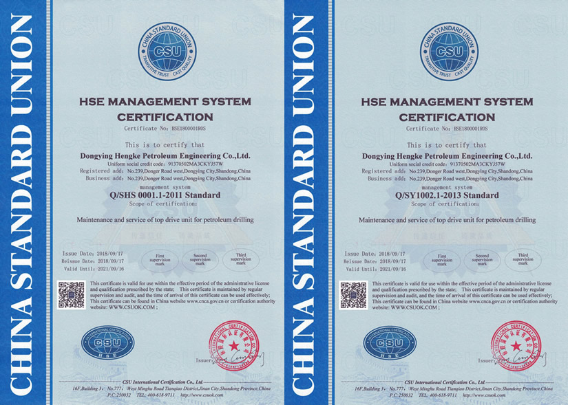 HSPE关于健康、安全和环保方面的管理体系是依据中国石油化工集团公司企业标准Q/SHS0001.1-2001《中国石油化工集团公司安全、环境与健康(HSE)管理体系》标准、参照GB/T24001-2004《职业健康安全管理体系规范》并结合公司实际情况建立的,旨在保证公司的顶驱维修、服务、租赁和配件销售等活动都在安全、环境与健康的法律、法规要求范围内进行,追求最大限度的不发生事故、不损害人身健康、不破坏环境,努力向国际HSE管理的先进水平迈进。